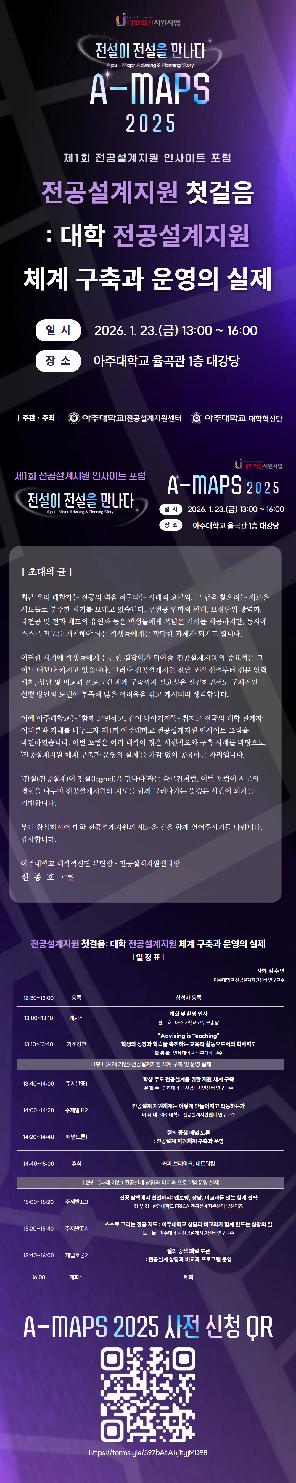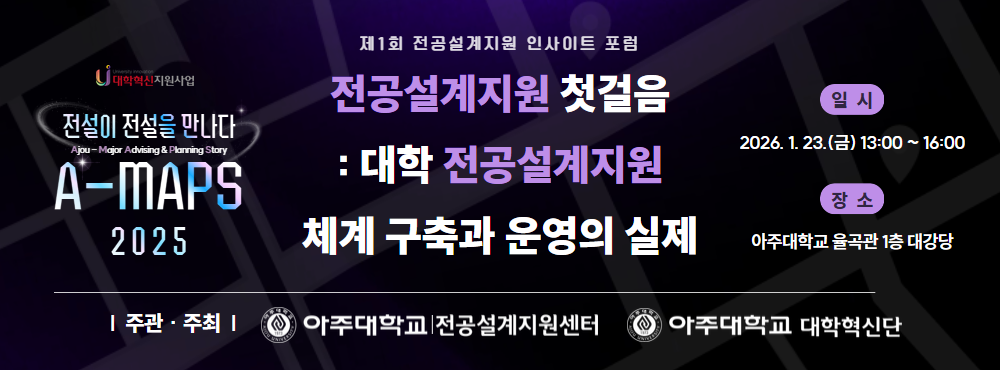 아주대학교 전공설계지원센터에서 전공설계지원 관련 노하우를 공유하고 시사점을 논의하기 위한 인사이트 포럼 'A-MAPS 2025'를 개최하고자 합니다.