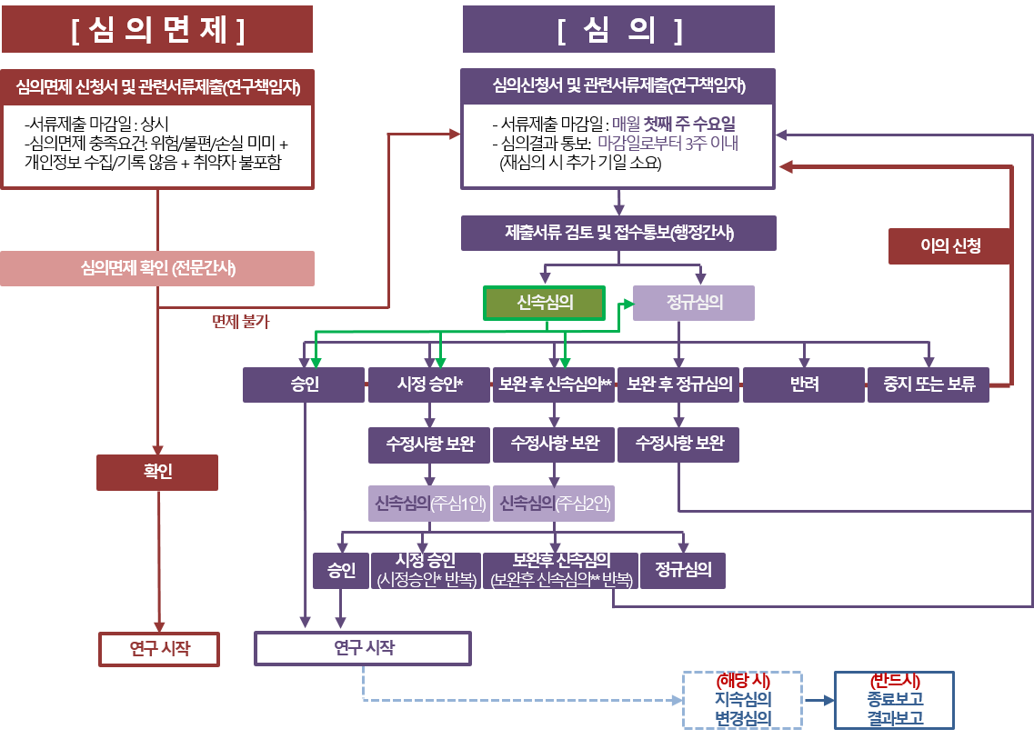 - 수정 후 신속심의 - 수정사항 보완 - 신속심의(주심2인) - 승인 - 연구시작 - 지속심의(1년이상), 변경심의(변경 시) - 종료보고, 결과보고